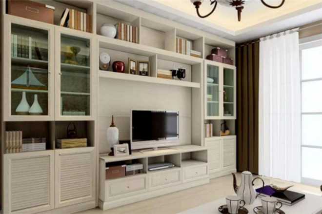 4、日常生活中是有很多的杂物的,不管是什么户型都需要做好收纳。可以打造满墙的收纳柜,在侧面加堵墙伪装成嵌入式,看不见侧板,更显轻薄。吊柜底部不高一米,站立看不到底板更显得空间高!
