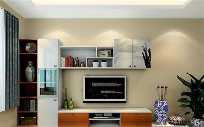 装修伙伴网建议:如果是小户型,非常不建议在墙面做太多柜子。电视柜的设计以轻巧为宜,在考虑电视柜和吊柜的设计之前,先考虑客厅的面积大小,以及设计完了之后,可能要面临的清洁打扫问题,还有承重问题等。电视柜不能只看表面华丽与否,它的高度一定要与对面的沙发相匹配。