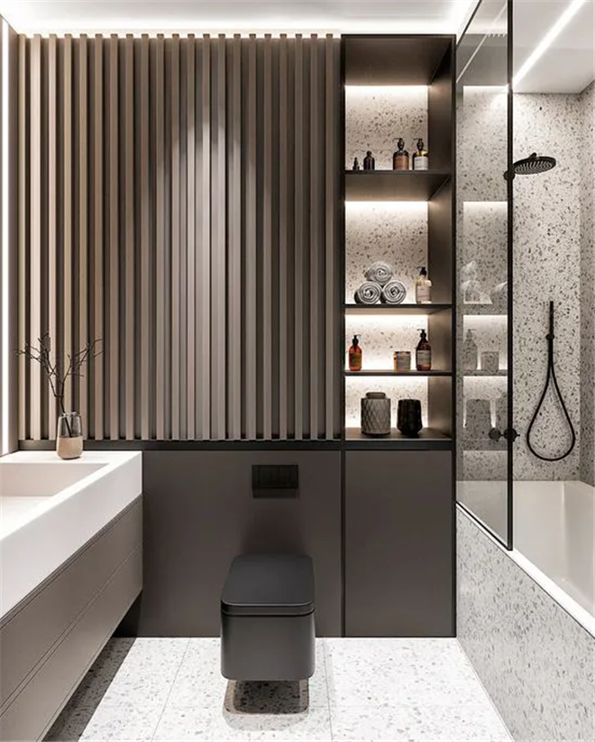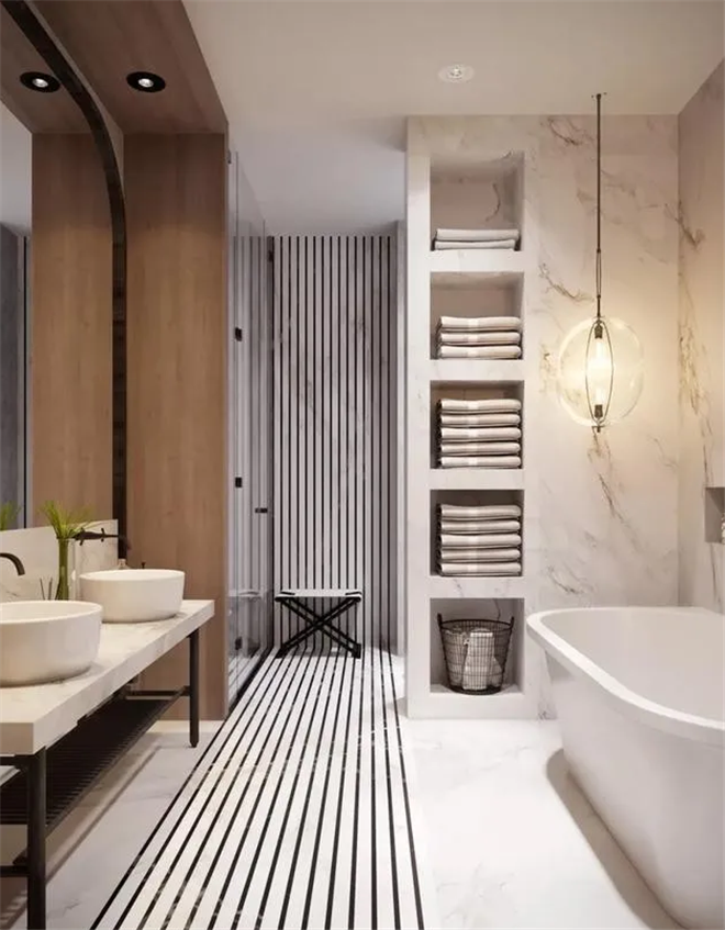 淋浴区、浴缸空间,很容易堆积沐浴露等洗漱产品,不仅显得杂乱,而且毫无美感可言。但是融入壁龛设计后,可以使整体风格变得统一有格调,又能起到很好的收纳作用~