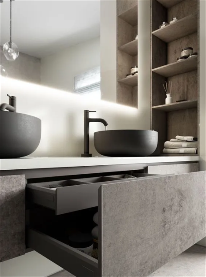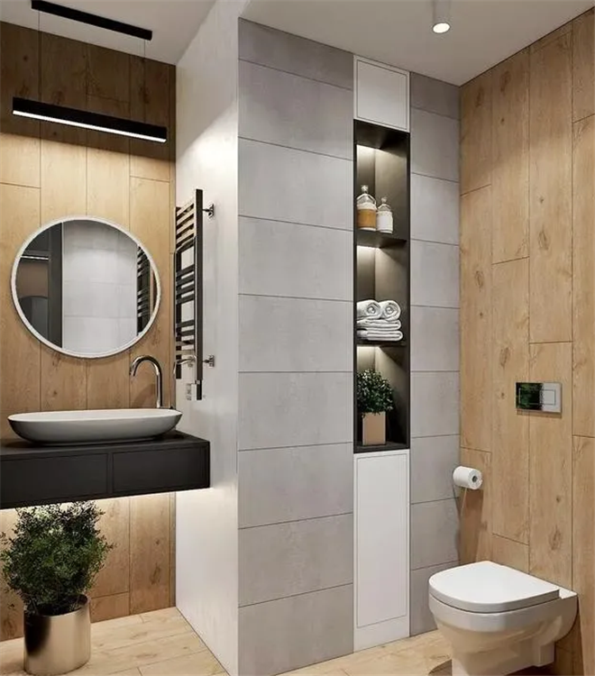 卫生间容易出现不规则空间,比如夹缝位置,这里可以采用搁板,做成壁龛的形式,顺手取放更方便。