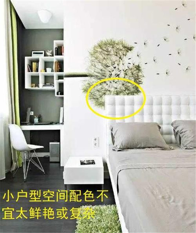 墙面颜色不要选择暗哑色调,整个空间的配色不要太鲜艳太复杂。一个空间最好不要超过三种不同的色调,可以通过颜色的深浅变化增加层次感。小户型因空间的限制,视野和采光都会相对较差。