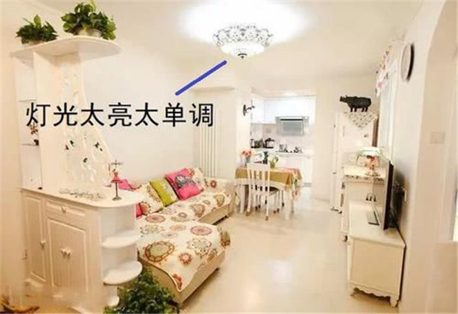 不少小户型业主往往只布置一个或几个主灯,但是这样显得过分单调。小空间的布光应该有主有次,主灯应大气明亮,以造型简洁的吸顶灯为主,辅之以台灯、壁灯、射灯等加以补充。相配的灯具和光线的运用,会使空间氛围更好。但居室的光线太强也不好,如果到处都是强光,则会让人有晃眼的不适感。