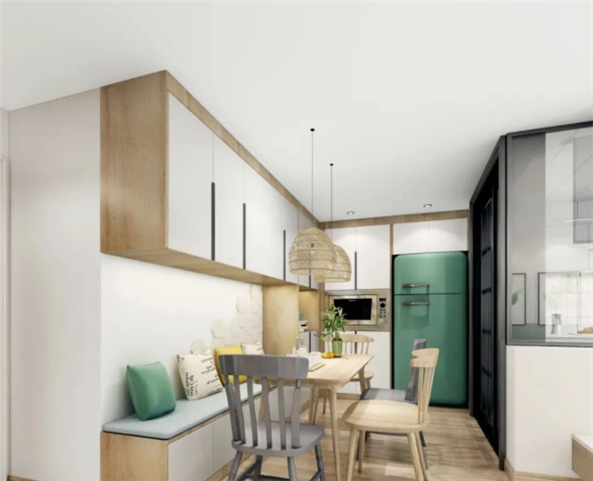 在面积有限的小户型中,卡座在餐厅区替代了较为笨重的椅子,这样的设计使得餐厅能够被最大化地利用起来,有效增加空间的利用率。即使家里的人比较多时,用餐也不会很拥挤。