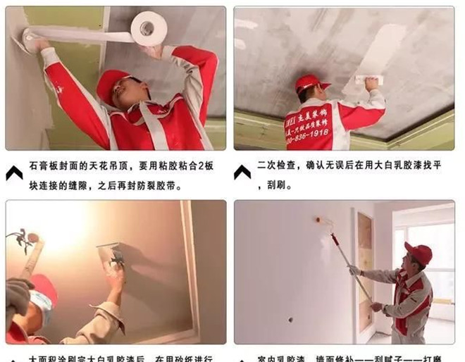 如果木工手打柜体,这就需要油漆工重新上漆或者喷或刷保护漆。以及窗帘盒、灯盒刮腻子上漆,再进行天花板吊顶、墙面刮至少2次的腻子处理。尤其是石膏板封面的天花吊顶需要用粘胶粘合2板块连接的缝隙,之后再封防裂胶带,最后上大白乳胶漆。如果是喷漆工艺的的话,就要保证保护措施要做好,表面裸露的家具、瓷砖等成品都需要包好。
