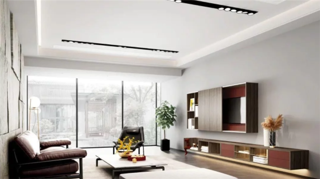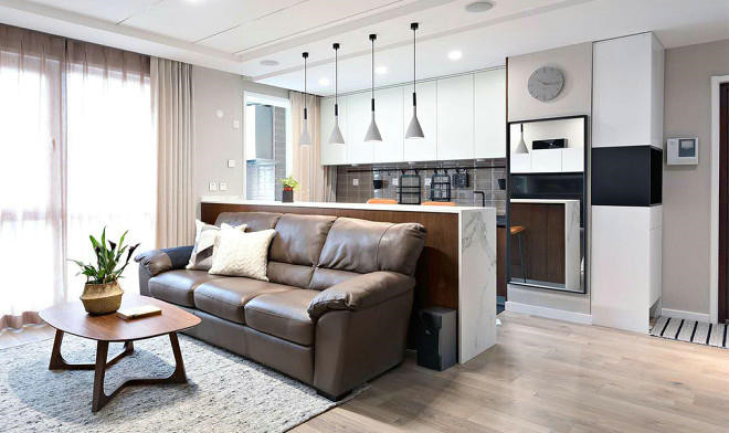 ▲只用白 棕两色完成整个客厅空间,白色作为客厅中明度最高的色彩,通过明度差的滴鼻,彰显了干练感。