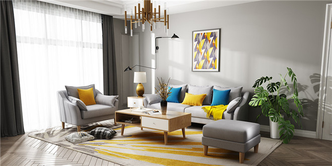 这些家具要比背景色饱和度更高、更亮眼,增强两者的对比效果,突出它们在客厅的主角地位。
