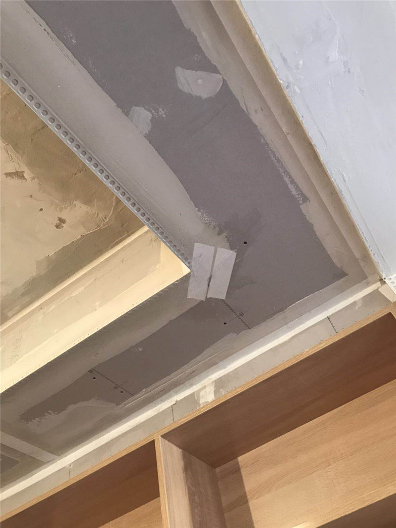 天花板的拐角处,承重最大,所以用 “牛皮纸胶带” 贴上。拐角有了这样一个 “创可贴” 的帮助,就算热胀冷缩,木板错位,也不会有多大的影响。