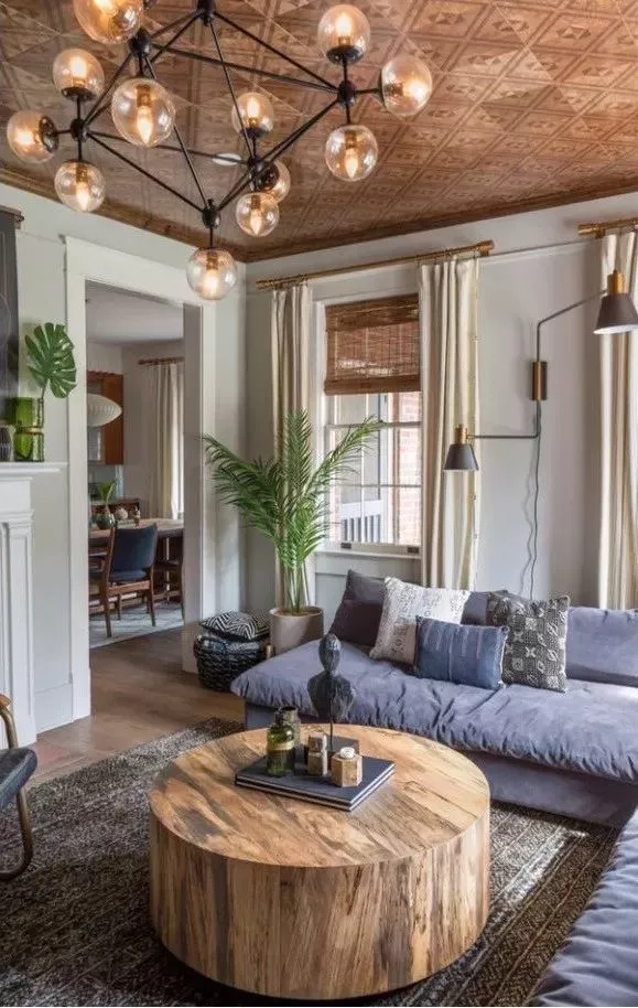 木质圆柱矮茶几 紫灰色坐地沙发,显得非常重,更适合大户型